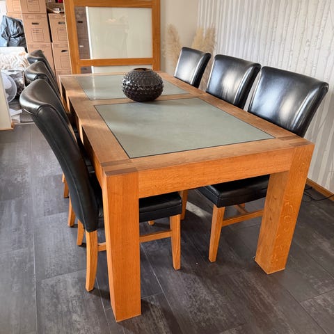 Rejält matbord i massiv ek med 40 mm skiva. 6 stolar, också dessa i massiv ek, och alcantara-liknande tyg. Mycket bekväma.