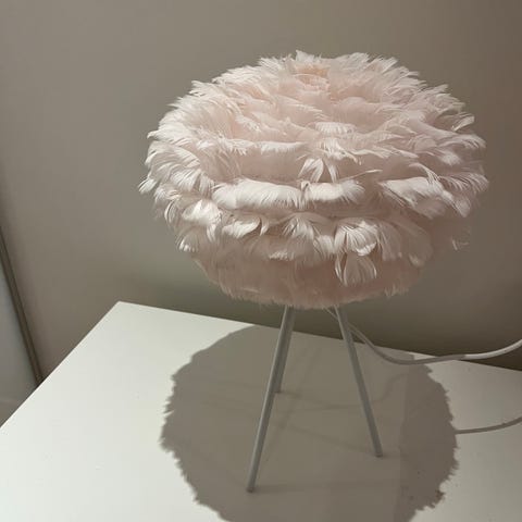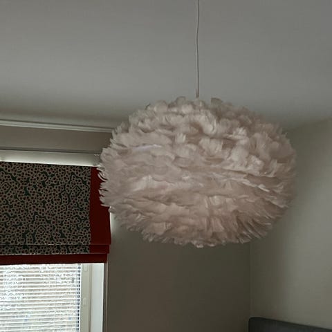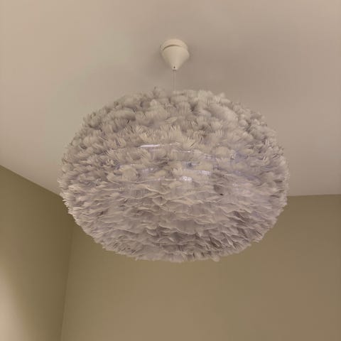 Tillverkad för hand av tunt papper och dunfjädrar. Lampa medföljer.