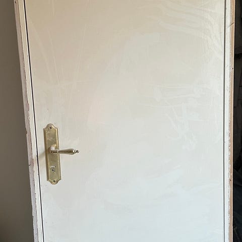 Vänsterhängd dörr med mässingsknopp och gångjärn