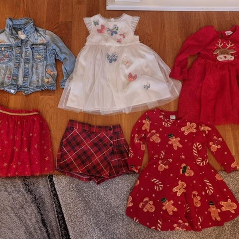 Kläder i olika storlekar samt roliga, pedagogiska leksaker.