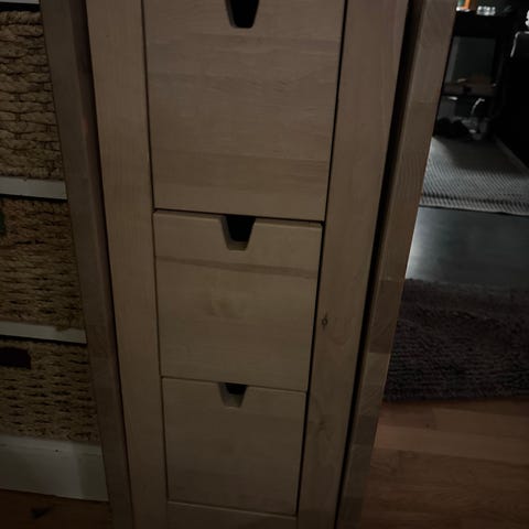 Ena sidan av bordet har stått mot vägg, så nyansen på träet är lite ljusare på ena sidan, samt några små ringar från en ljusstake som stått på bordet(se bild). Går givetvis att slipa ner om man skulle vilja det!