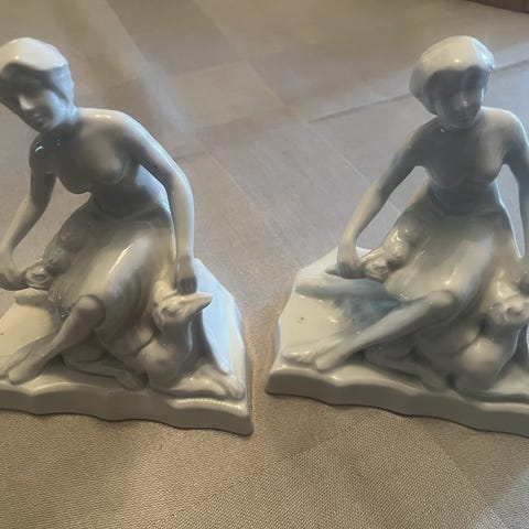 Två porslins katter i orange och rosa färger. Figurerna är dekorerade med geometriska mönster i olika färger. De kan användas som dekorativa föremål i hemmet.