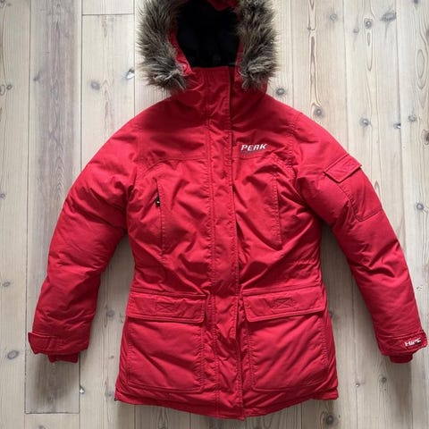 Fin och obetydligt använd dunjacka (80% dun/20% fjäder) med löstagbar luva. Inga revor eller skador på dragkedjor.