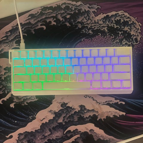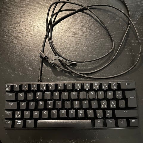 mekaniskt tangentbord med vit färg och ISO-layout. Tangentbordet har en kompakt 60-tangentsdesign och är utrustat med kabelanslutning. Passar för användare som söker ett mekaniskt tangentbord med nordisk tangentbordslayout.