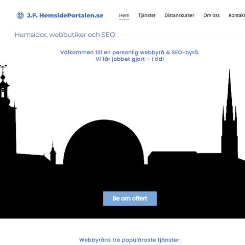 J.F. HemsidePortalen.se är en liten, personlig och professionell webbyrå som får arbetet gjort – i tid. Vi implementerar moderna webblösningar för både webshopar och hemsidor. Vi hanterar betalningslösningar som Klarna, Svea och PayPal och uppgraderar till PHP 8.3–8.4. Vi är även specialister inom SEO och hjälper er att synas högt upp på Google med strategier för digital tillväxt. Varmt välkommen.