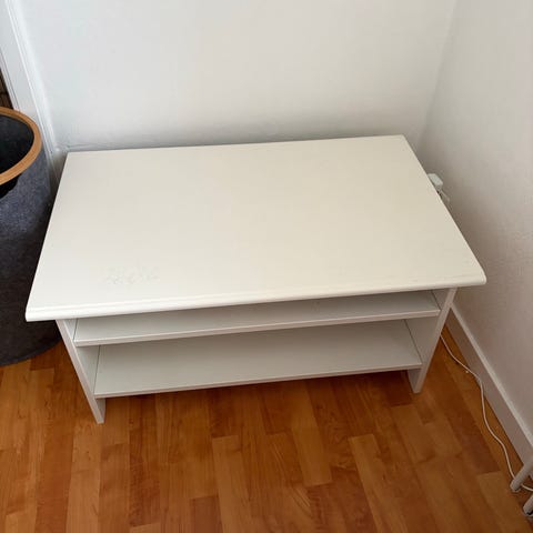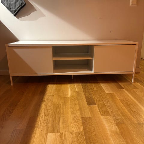 Jysk TV-bänk i svart metall. Möbeln är designad av Aage Petersen och erbjuder en enkel och funktionell förvaring för tv och tillbehör.
