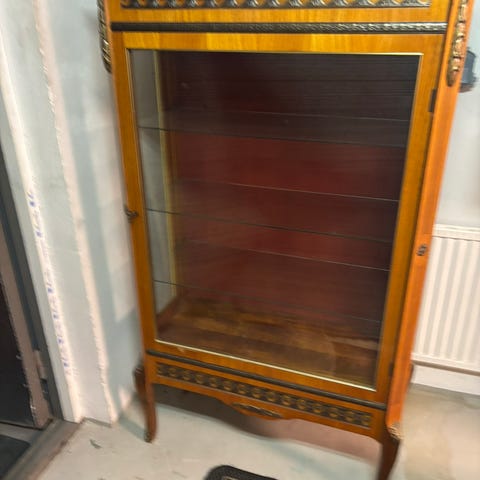 Vitrinskåp i trä med glasdörrar och flera hyllplan. Skåpet har en mörk träfinish och dekorativa detaljer. Passar för förvaring och visning av samlarföremål eller prydnadsföremål.