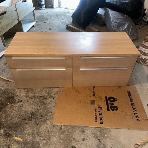 Två hyllor på ena sidan och 4 stycken lådor samt en hylla på den andra sidan