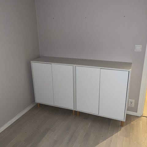 Sideboard beståendes av ett vitt IKEA Eket 70cm x 70cm med vita dörrar. Nypris på IKEA är 1 095kr.