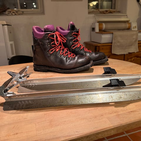 Skyllermarks långfärdsskridskor 45 cm långa med ställbara fästen för att passa olika storlekar av pjäxa. Har legat på en vind under det ett antal år och innan dess använda ett fåtal ggr. Pjäxor som passar till i storlek 38 kan följa med om så önskas.