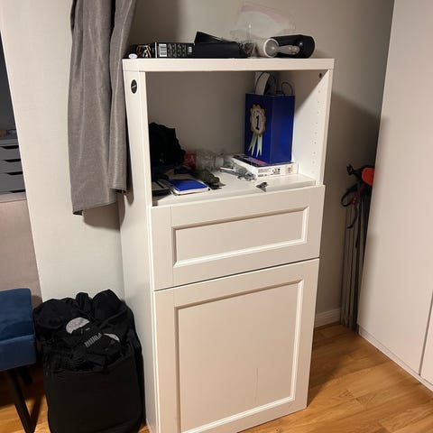 Ikea skåp minns inte designer. Och vi har tagit bort skivan på baksidan (för att kunna ha sladdar och tv boxar i) resten av skåpet är i bra skick.