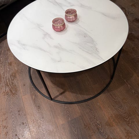 Runt soffbord från Jotex i obehandlad mässing som ger bordet en härlig patina och karaktär. På ovansidan av bordet har det installerats en glasskiva för att skydda ytan. 80 cm diameter. Nypris 5 499 kr.