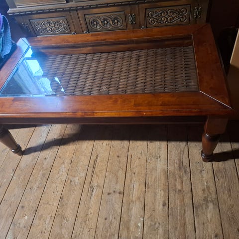 Soffbord tillverkat i trä med en fyrkantig bordsskiva och snidade ben. Bordet har en klassisk design med böjda ben och en naturlig träfärg. Passar för användning i vardagsrum som ett dekorativt och funktionellt möbel. Rokokostil.