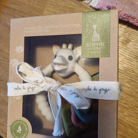 Sophie la Girafe är perfekt som barnets första sinnesutvecklande bitleksak och leksak . Den är gjord av 100 % naturligt gummi och målad med livsmedelsfärger. Giraffen verkar lugnande och tröstande för din bebis, speciellt när den lille håller på att få tänder.