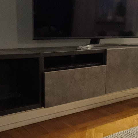 TV-bänk ”BESTÅ” från IKEA. Svart stomme med 3st gråa luckor samt ett hyllplan för förvaring. Skickar med 5st justerbara ben från märket Habo.