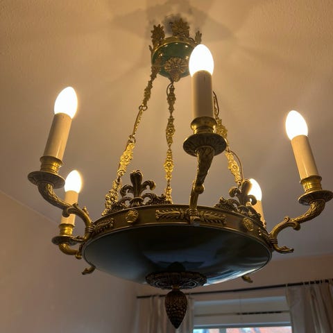 Bordslampa med fot i keramik som har ett mönster av blommor och fåglar. Lampan har en rund tygskärm med fransar längs nederkanten. Passar som belysning i olika rum.