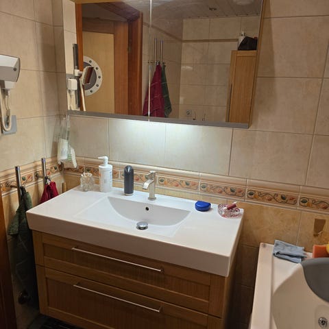 Badrumsmöbel med dubbla handfat och spegel med belysning