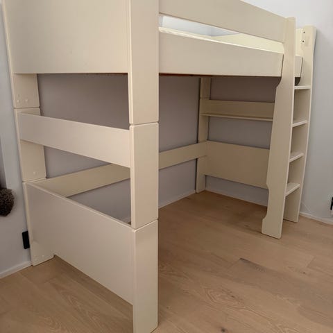 En loftsäng från Mio. Några mindre skavanker men ok skick ändå tycker jag. Däremot: en ribba har en spricka (se bild) och behöver bytas ut men är ändå enkelt gjort! Nypris: 3900 kr