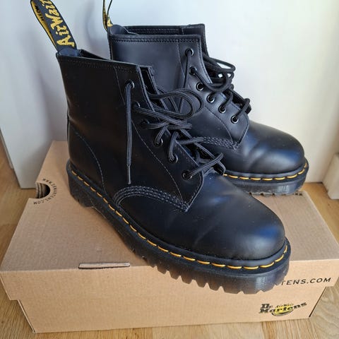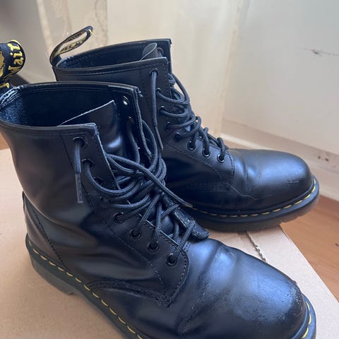 Ett par svarta, fodrade kängor / boots från Dr. Martens, i modellen "1460 Serena J". Storlek 36, innermått ca. 23,5 cm. De kanske kan funka även för den som vanligtvis har storlek 35? De har dragkedja på insidorna vilket gör det enkelt att ta på, och av dem. Skorna är använda men i generellt fint bruksskick enligt mig. (Ändarna på skosnörena har lite "skav", vilket du ser på sista bilden.) Titta noga på bilderna för egen bedömning av skicket innan köp.