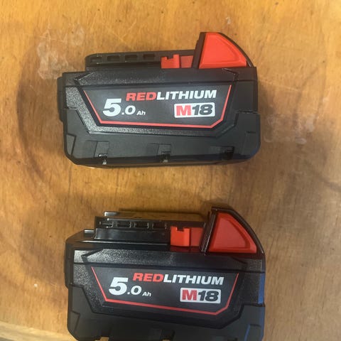 Milwaukee M1418C6 batteriladdare för batterier i M18 och M14-serierna. Laddaren har flera laddningsportar och är avsedd för professionellt bruk. Produkten är röd och svart och levereras i originalförpackning. Köpt 2025 augusti, använt endast en gång.