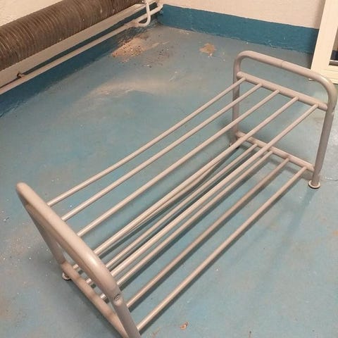 Skoställ i trä och metall med två hyllplan för förvaring av skor. Passar för användning i hall eller garderob för att organisera och förvara olika typer av skor.