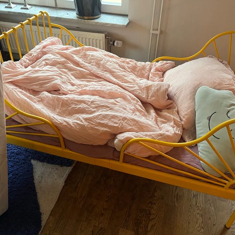 IKEA Luröy utdragbar säng i trä. Sängen är utformad för barn och kan dras ut för extra sovplats. Den har en enkel och funktionell design.