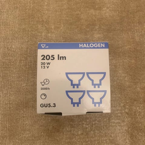 Halogen GU10 lampa med effekt på 35 watt och spänning 230 volt. Ljusflöde på 200 lumen. Livslängd cirka 2000 timmar. Förpackningen innehåller 3 lampor.