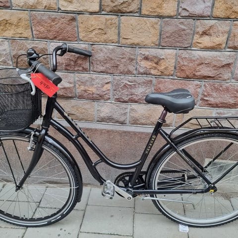 Handbroms fram och fotbroms bak. Belysning fram och bak.