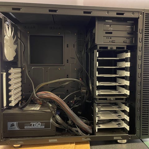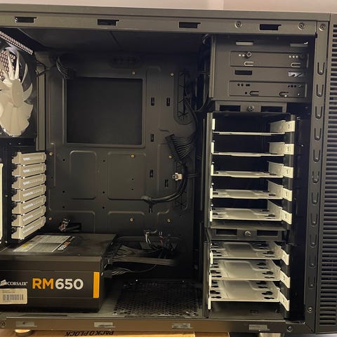 Datorchassi i svart färg med standardstorlek. Chassit har plats för flera expansionsplatser och är anpassat för montering av datorns komponenter. Designen inkluderar ventilationsöppningar för kylning och stöd för kabelhantering.