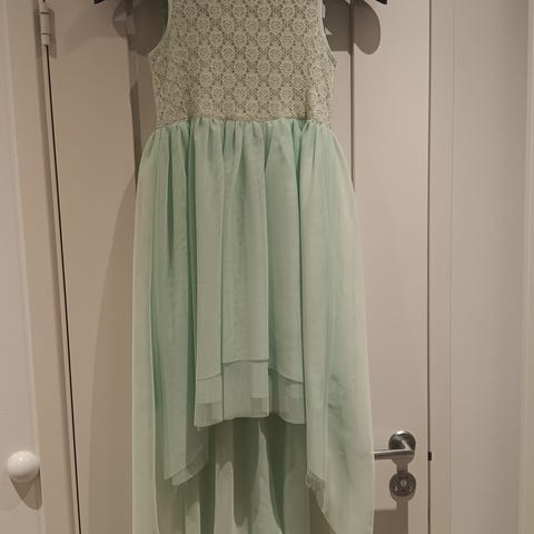 Lindex klänning för flicka, som ny, i bra skick, storleken är 134, medföljer ett par nya strumpor, tvättat med parfym fritt tvättmedel, kommer från djur och rökfritt hem, finns i Nacka, kan skickas mot fraktkostnaden.