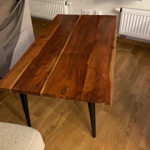 Säljer ett ovalt soffbord i vit laminat och ben i borstat stål. Inga spår av användning, inga hack i bordskivan. Inköpt på Svenska Hem för några år sedan.