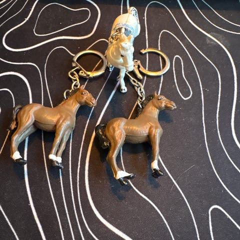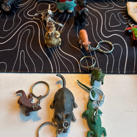 Set med flera nyckelringar som har figurer i plast och tyg. Innehåller bland annat en trollfigur med rosa hår, en nallebjörn och andra karaktärer. Olika färger och material används för figurerna.