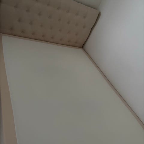Sängramen går tyvärr inte att montera ner och är lite amatörmässigt ihopsatt (den kom i plankor..!). Sängramen har inte heller några ben utan ligger mot golvet (jag har satt på möbeltassar). Det ingår även två små sängbord som är i höjd med sängramen