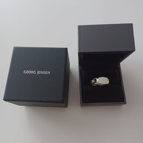 George Jensen Sterling Denmark ring tillverkad i sterlingsilver med en oval turkos sten. Ringen har en dekorativ infattning. Materialet är sterlingsilver, och stenen är turkos, vilket ger en unik och naturlig färg. Mycket bra skick. Storlek17. Vikt 5gr.