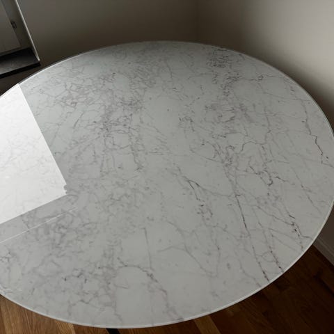 Runt matbord, Glasbord marmorinspirerat från Mio. Svarta metallben.