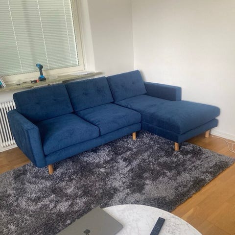 Beige divansoffa med tyg av polyester och ben i trä/mörkbrun. Soffan har måtten: djup 95 cm, höjd 78,5 cm, bredd 297 cm. Divandelen är 160 cm djup och 127 cm bred. Sittbredd är 243 cm, sittdjup 60 cm och sittdjup på divan 127 cm. Sittshöjd är 43 cm, benhöjd 18 cm och armstödet är 27 cm brett och 17,5 cm högt. Höjd från golv till armstöd är 60 cm och ryggstödets höjd är 38 cm. Soffan har plats för 3 personer. Den tvättades nyligen med sofftvätt. Användes ca 1 år. Pris går att diskutera hämtas i barkarby staden.