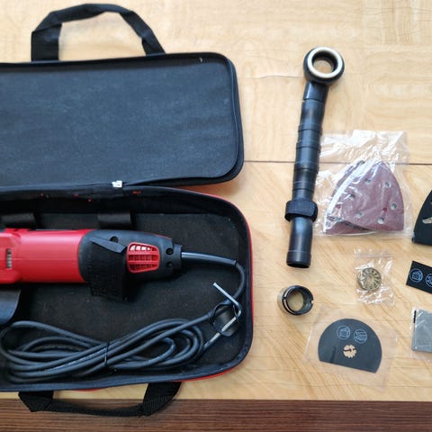 Fein multiverktyg AFSC18Q(SL) följer med två batterier och laddare och förvaringsväka och inkluderar flera olika blad.