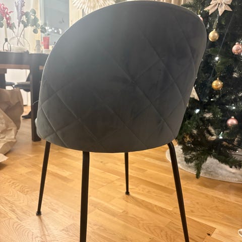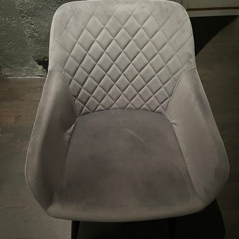 4 st Kokkedal matstolar med sittdyna i grå sammet och ben i svart metall. Stolen har en stoppad sits och ryggstöd med quiltad design.