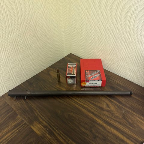 Pipa kaliber .375 H&H som kräver licens. Slutstycke medföljer som är onumrerat och som vapnen såldes 2005. RCBS laddverktyg. 201 st Norma Oryx-kulor 19,4 gram. 118st tomhylsor mestadels Norma och några Remington (de blanka). Det finns 23st hemladdade patroner som man kan få överta mot ett särskilt godkännande, annars går de till destruktion hos Polisen. Pipan är bara skjuten de tomhylsorna du ser på bilden och någon hemladdad ask till så det är i princip nyskick. Finns utanför Sundsvall. 15 000 kronor eller ett vettigt bud