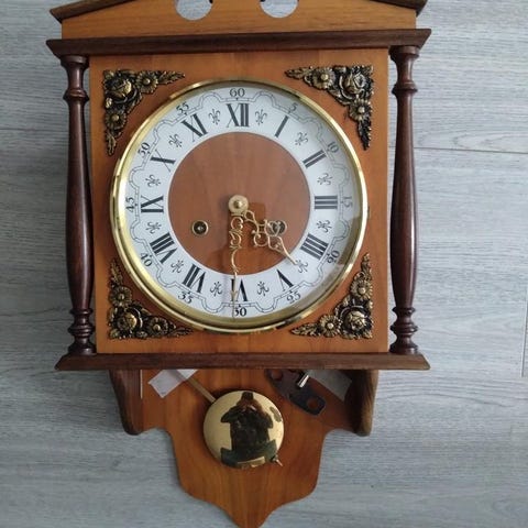 Väggur Genfa från 80-90-talet. Använt någon månad. Testat att den fungerar. Storlek 30x43 cm. Nyckel ej original