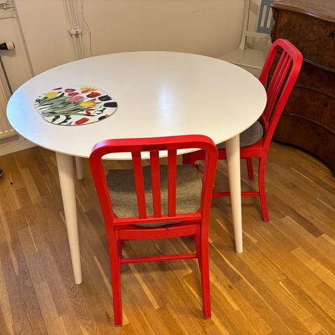 Bordet är i bra använt skick, några mindre repor på bordskivan.