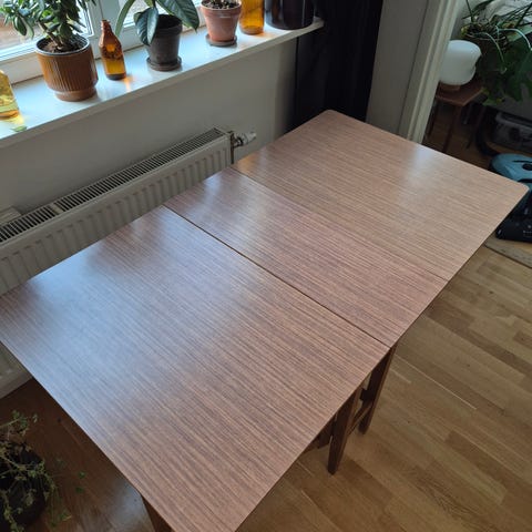 Flexibelt matbord med utfällbara klaffar för den mindre matplatsen, blir bara drygt 30 cm helt ihopfällt.