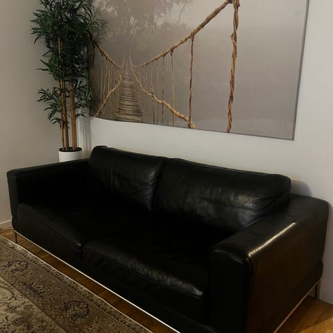 säljer denna soffan som är klädd i svart läder. Soffan är avsedd för sittkomfort med vadderade armstöd och ryggstöd. Passar för vardagsrum eller loungeutrymmen. Man kan ta upp ben stöd genom en knapp vid sidan om. Den säljs på grund av att vi ska köpa en ny soffa. Hör av er för mer information eller om ni är intresserade!