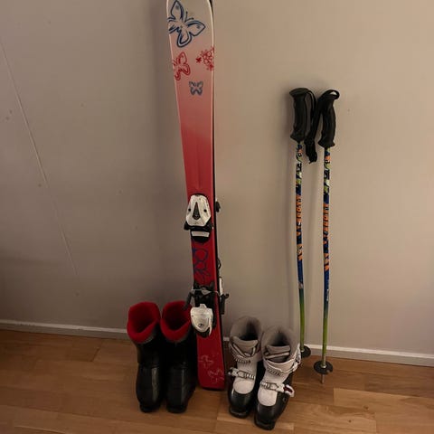 Head skidor i färgerna vit och röd. Skidorna är avsedda för vintersport och har bindningar monterade. Passar för alpin skidåkning.