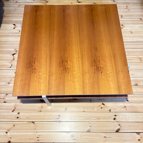 Mått enligt beskrivningen. Bordet är i fint skick, någon enstaka repa på kanten (se detaljbild) men i övrigt inget att anmärka på. Lättviktigt och ihåligt undertill.