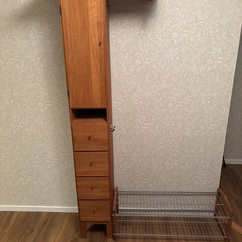 Hallmöbel med skohylla och väggkrokar och stålgalgar.