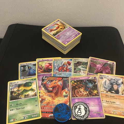 Samling av Pokémon spelkort med olika motiv och typer. Kortens storlek och material är standard för Pokémonkort. Passar för samlare och spelare av Pokémonkortspel.