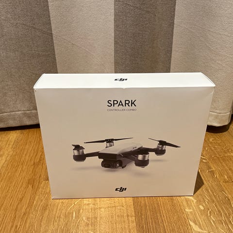 DJI Spark drönare i vit färg. Kommer med fjärrkontroll, två batterier med laddare, propellarskydd och bärväska. Drönaren är kompakt och lämplig för fotografering och videoinspelning från luften.