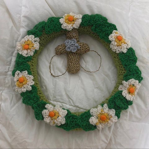 Handarbete virkat påskkrans med kycklingar