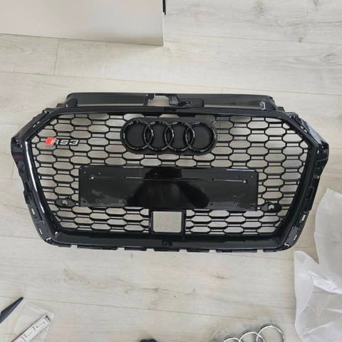 Audi frontgrill med monterat Audi-emblem. Grillen är svart och avsedd för montering fram på fordonet.